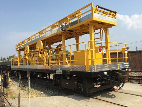 为无动力车辆,主要由轨道平车和作业平台(贯通作业平台或升降作业平台)组成,可由轨道车、接触网作业车等牵引车连挂,用于隧道内汇流排架设和检修、接触网架设、检修作业及场站等高空作业。
